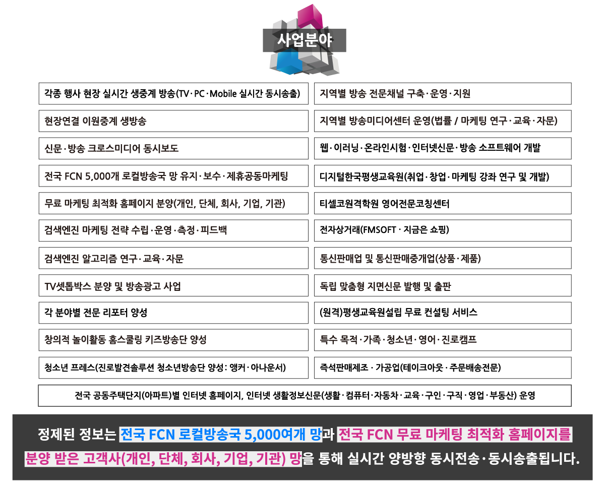 취업, 소자본 창업 등을 희망하는 이들이라면 FCN공동마케팅시스템이 탑재된 로컬방송국에 관심을 갖길 바립니다.